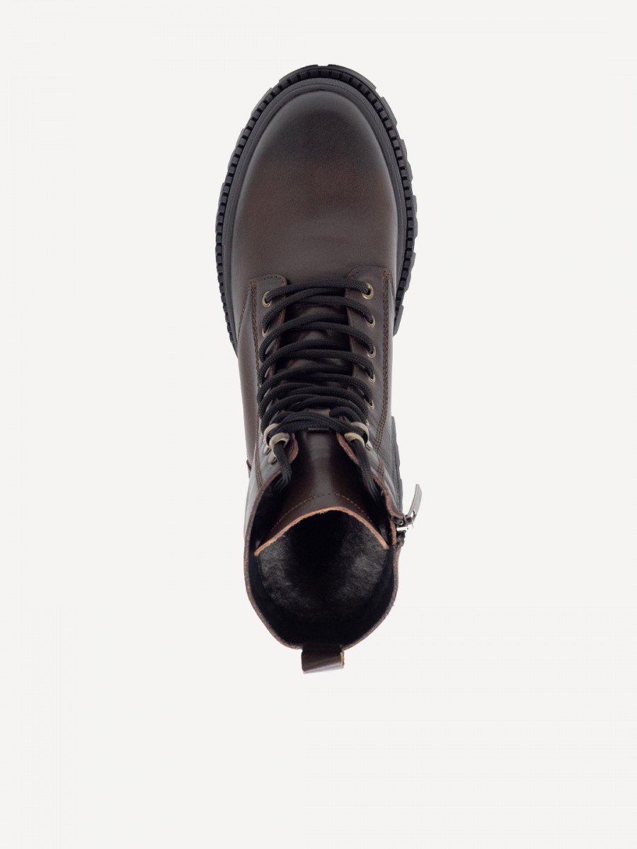 Верх ботинок выполнен из натуральной кожи, что обеспечивает долговечность и прочность изделия. Подкладка из натуральной шерсти гарантирует сохранение тепла и комфорт при носке.
