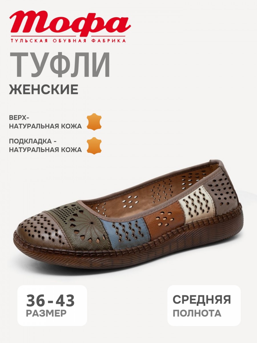 Стильные и удобные женские туфли 612971-5 Tofa отлично подойдут для повседневной носки в летний период. Верх выполнен из натуральной гладкой перфорированной кожи. Подкладка - также натуральная кожа. У модели почти отсутствует каблук, полнота - 7, застежки отсутствуют.