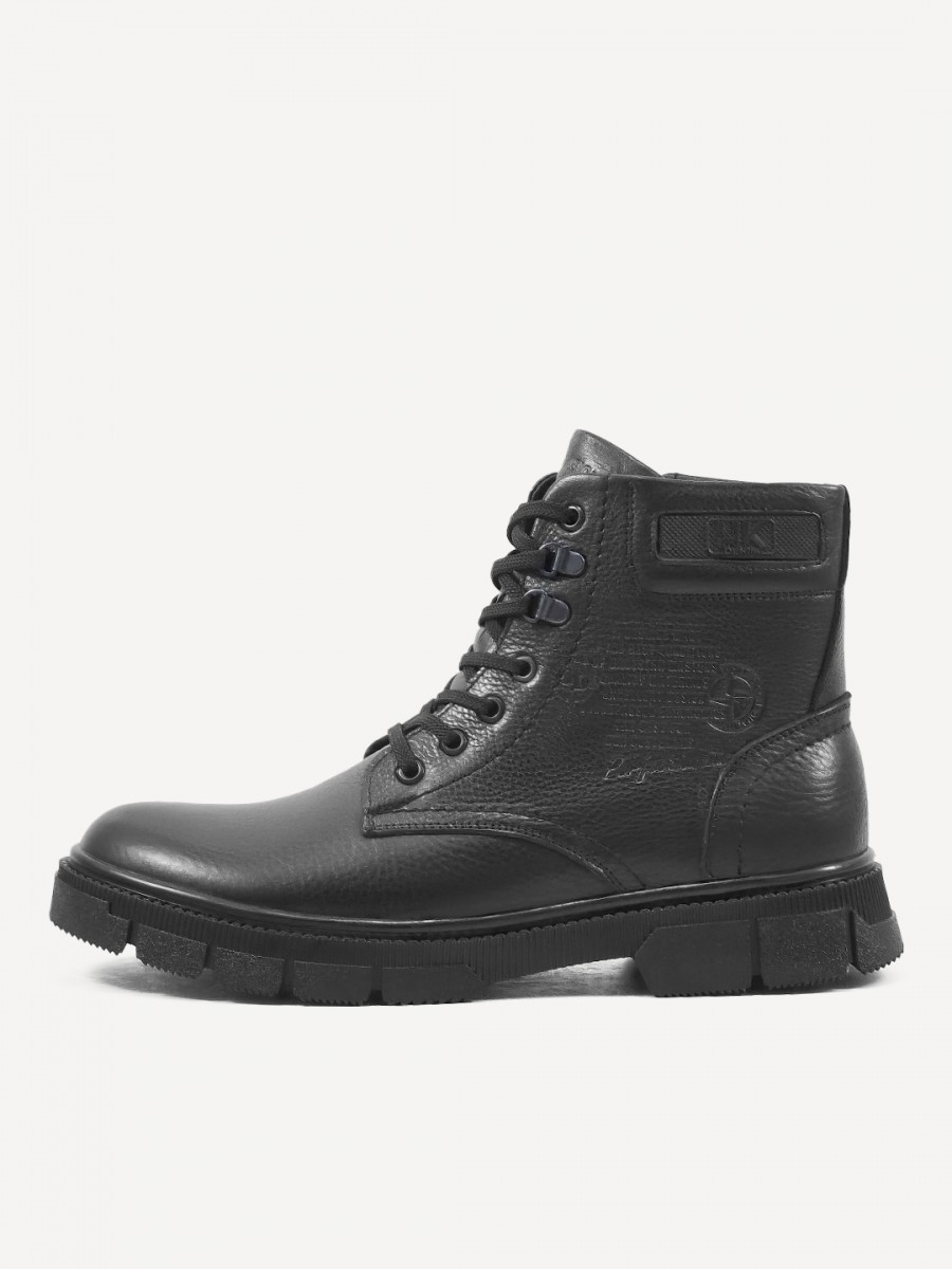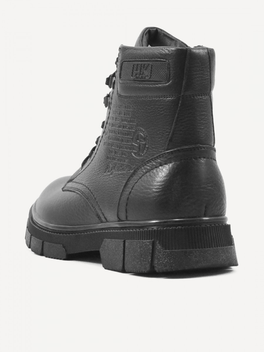 Верх ботинок выполнен из тисненой натуральной кожи, что обеспечивает долговечность и комфорт при носке. Подкладка из натуральной шерсти сохраняет тепло и обеспечивает сухость ног.