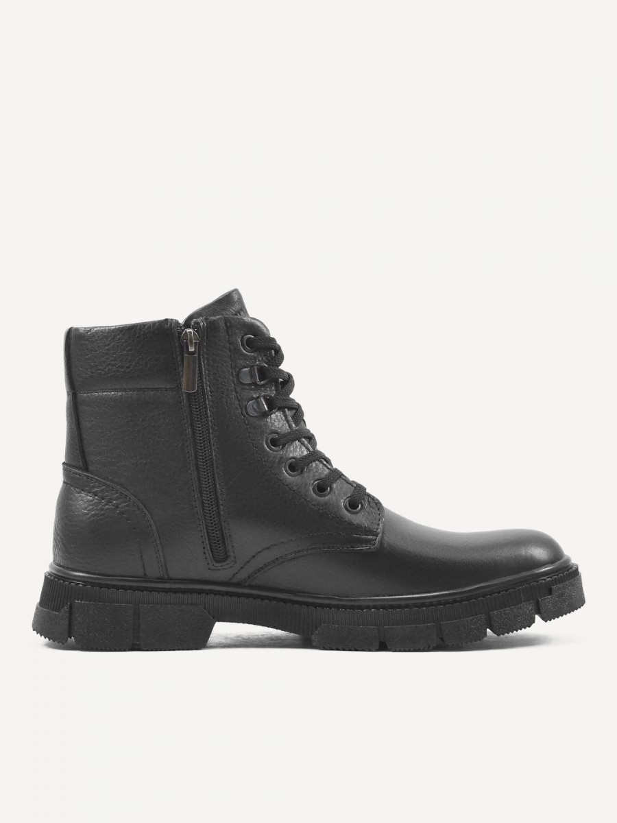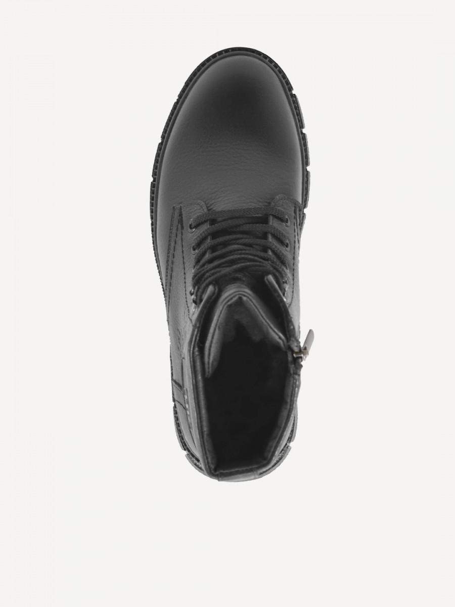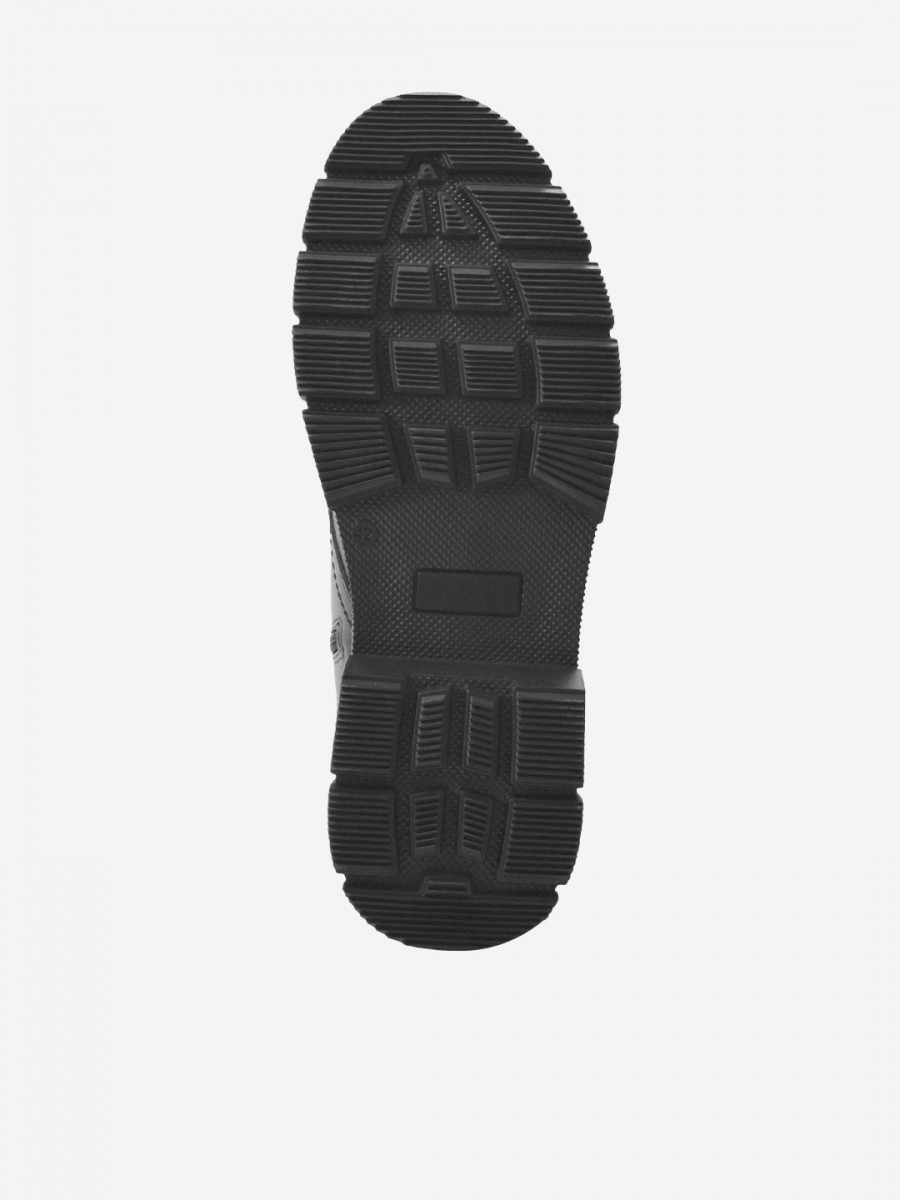 Толстая подошва с глубоким протектором и невысокий каблук (4 см) гарантируют устойчивость на скользких поверхностях и комфорт при ходьбе. Застежка на молнии и шнурках обеспечивает надежную фиксацию и удобство надевания.