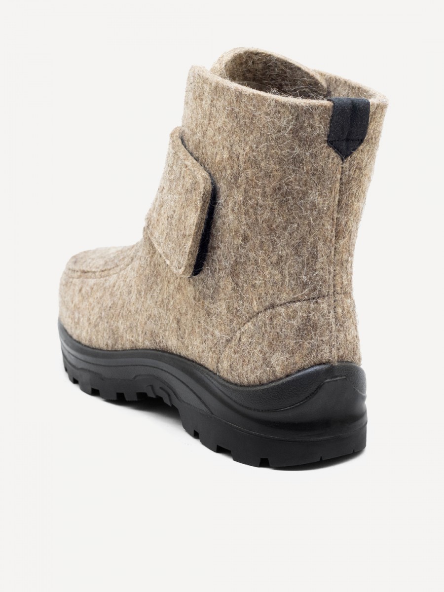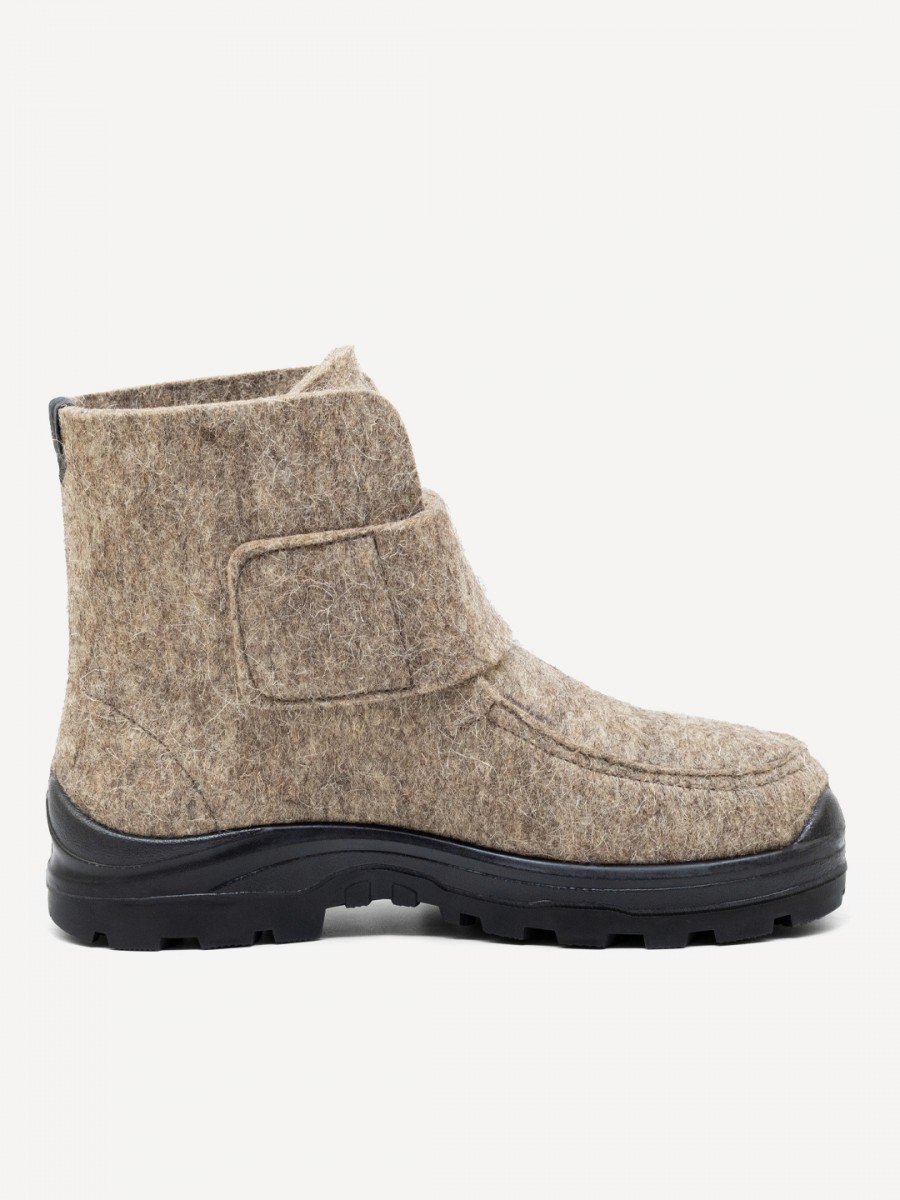 Верх полусапог выполнен из войлока, что гарантирует долговечность и сохранение тепла. Подкладка отсутствует, что делает обувь легкой и удобной для ношения, а также позволяет использовать теплый носок. Стелька также изготовлена из войлока, обеспечивая дополнительную теплоизоляцию и комфорт при ходьбе.